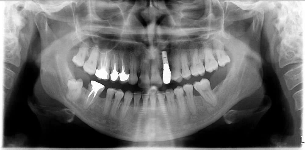 Traitement réalisé chez une femme de 33 ans. La patiente présentait l’absence des deux incisives latérales maxillaires (= agénésies), la canine de lait maxillaire gauche était encore sur arcade et la canine définitive, incluse dans l’os en position haute et oblique. Il a été choisi d’extraire la canine incluse et la canine de lait afin de poser un implant dans ce site. Le traitement orthodontique a permis d’aménager un espace de diamètre identique à la canine droite, de corriger les malpositions et d’améliorer l’engrainement entre les dents maxillaires et mandibulaires. Le traitement a duré 30 mois.